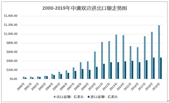 2000-2019年中澳(澳门对中国)双边进出口贸易额走势图