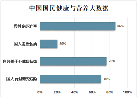 《中国国民健康与营养大数据报告》(以下简称“报告”)显示,70%国人有过劳死危险,76%的白领处于亚健康状态,20%国人患慢性病,慢性病死亡率占86%。