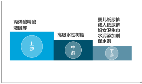 由于SAP具有吸水性好、价格适中、安全性好等特点,已被广泛应用于婴幼儿纸尿裤、妇女卫生用品、成人失禁用品等一次性卫生用品中,这些领域一般将丙烯酸钠盐作为交联聚合单体。此外,SAP作为吸水材料在农林保水、工业、医疗等领域也有广泛的应用,在农林保水领域,通常采用交联型丙烯酰胺/丙烯酸钾共聚物。高吸水性树脂产业链