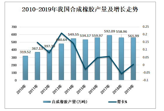 2010-2019年我国合成橡胶产量及增长走势