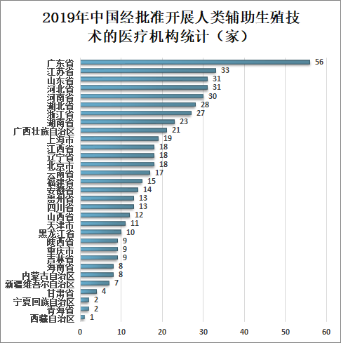 2019年中国经批准开展人类辅助生殖技术的医疗机构共517家,其中广东省56家、江苏省33家、河北省31家、山东省31家、河南省30家、湖北省28家、浙江省27家、湖南省23家、广西壮族自治区21家、上海市19家、北京市18家、辽宁省18家、江西省18家、云南省17家、福建省15家、安徽省14家、四川省13家、贵州省13家、山西省12家、天津市11家、黑龙江省10家、吉林省9家、重庆市9家、陕西省9家、内蒙古自治区8家、海南省8家、新疆维吾尔自治区7家、甘肃省4家、青海省2家、宁夏回族自治区2家、西藏自治区1家。