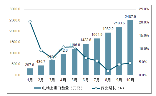 2019年1-10月中国电动表累计进口数量及增速趋势图