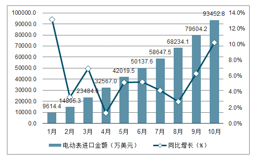 2019年1-10月中国电动表累计进口金额及增速趋势图