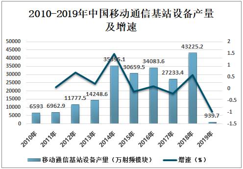 2010-2019年中国移动通信基站设备产量及增速