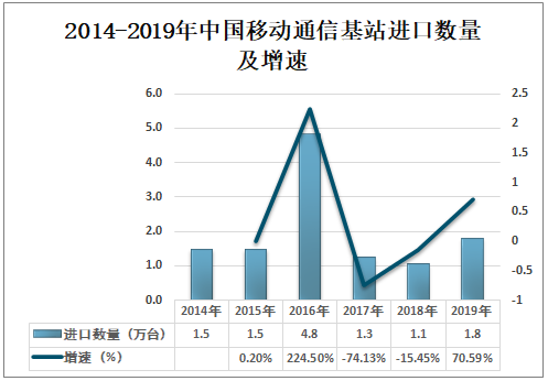 我国移动通信基站进口数量在2016年达到峰值,移动通信基站进口数量为4.8万台;2017年开始移动通信基站进口数量呈波动上升趋势,2018年中国移动通信基站进口数量1.1万台,同比下降15.45%;2019年中国移动通信基站进口数量1.8万台,同比增长70.59%。2014-2019年中国移动通信基站进口数量及增速