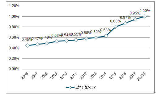 自2014年46号文出台以来,我国体育产业近几年一直保持着快速增长。根据国家体育总局的统计显示:2017年,我国体育产业总规模(总产出)为21987亿元,同比增长15.66%;增加值为7811亿元,同比增长20.64%,占同期国内生产总值的比重为0.96%。从名义增速看,体育产业增加值高于同期GDP增速约10.75个百分点,明显快于同期经济增长速度。长期来看,若保持现有的稳定增长,我国体育产业预计将顺利完成2020年总规模3万亿和增加值占GDP1%的目标。2006-2020年与我国体育产业增加值与GDP占比趋势预测