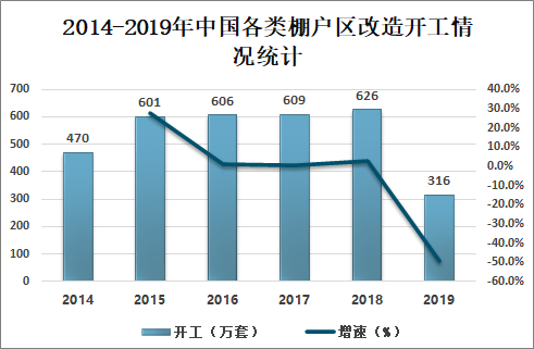 2014-2018年中国各类棚户区改造开工逐年增加,2018年中国各类棚户区改造开工626万套,同比增长2.8%,2019年较2018年有所回落,2019年中国各类棚户区改造开工316万套,同比减少49.5%。2014-2019年中国各类棚户区改造开工情况统计