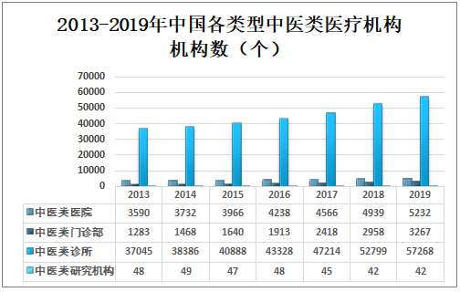 改革 30 多年来,中国中医、民族医药卫生事业的发展取得了显著成效,为建设小康社会医疗卫生服务体系打下了坚实的基础。中国中医类医院规模不断扩大且医疗服务设施不断完善。2019年中国共有中医类医院5232个,中医类门诊部3267个,中医类诊所57268个,中医类研究机构42个。2013-2019年中国各类型中医类医疗机构机构数(个)