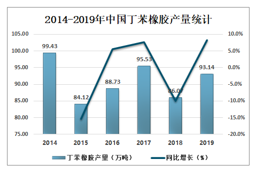 2015-2017年中国丁苯橡胶产量逐年增加,2018年开始回落,2018年中国丁苯橡胶产量为86.07万吨,同比减少9.90%,2019年较2018年有所回升,2019年中国丁苯橡胶产量为93.14万吨,同比增长8.22%。