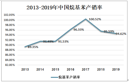 2013-2017年中国烷基苯产销率整体呈上升走势,随后出现下降趋势;2019年中国烷基苯产销率为94.62%,较2018年下降0.97%。2013-2019年中国烷基苯产销率