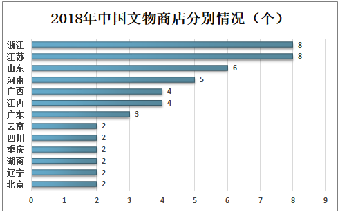 中国文物商店主要分布在浙江、江苏及山东等地区;2018年浙江、江苏、山东、河南及广西文物商店数量分别为8个、8个、6个、5个、4个。