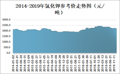 从2014-2019年氯化钾参考价走势图可以看出,2014-2017年11月氯化钾参考价较为平稳,2017年12月氯化钾参考价开始上涨,2019年8月开始缓慢下滑。2019年12月1日氯化钾参考价为2215.0元/吨,较2019年1月1日减少了205.0元/吨。