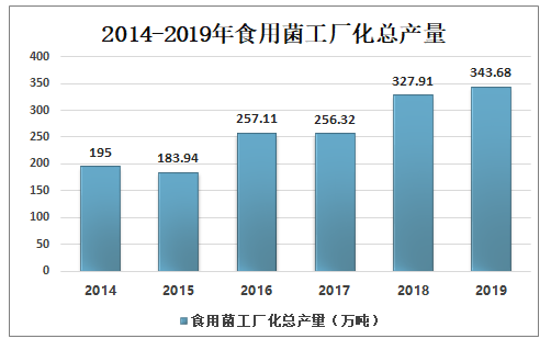 真姬菇又名玉蕈、斑玉蕈,外形美观,质地脆嫩,味道鲜美,具有海蟹味,也有人称之为蟹味菇、海鲜菇。中国自1986年3月从日本引进真姬菇栽培,主要有灰色和白色两个品系,现在福建、上海、山东、辽宁、山西、河北、河南等省均有栽培。自20世纪90年代末以来,中国丰富的食用菌生产原料和种质资源,优越的自然地理和气候条件,以及较充足的劳动力资源等为食用菌产业的发展奠定了良好的基础,使得中国食用菌产业飞速发展,成为世界上食用菌第一生产大国。2019年中国食用菌工厂化总产量为343.68万吨,较2018年增加了15.77万吨,同比增长4.59%。2014-2019年食用菌工厂化总产量