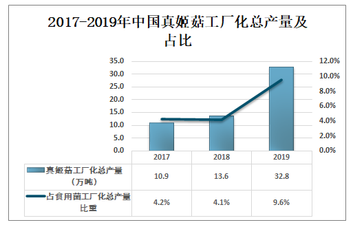2017-2019年真姬菇工厂化总产量逐年增加,2018年中国真姬菇工厂化总产量为13.6万吨,占食用菌工厂化总产量的4.1%。2019年中国真姬菇工厂化总产量为32.8万吨,较2018年同比增长58.63%,占食用菌工厂化总产量的9.6%。