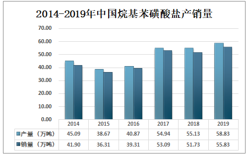 烷基苯磺酸盐作为传统的表面活性剂依然保持着主要的市场份额,根据中国洗协表面活性剂专业委员会数据统计:2019年中国烷基苯磺酸盐产量为58.83万吨,较2018年增加3.7万吨;2019年烷基苯磺酸盐销量为55.83万吨,较2018年增加4.1万吨。