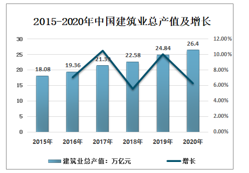 2020年国民经济稳定恢复,主要目标完成好于预期。2020全年国内生产总值102万亿元,比上年增长2.3%,其中:建筑业总产值26.4万亿元,同比增长6.28%。