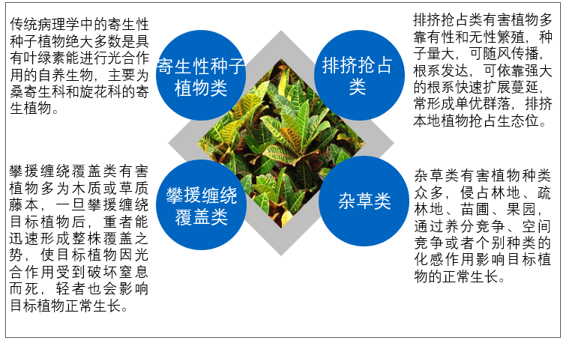 中国林业有害植物不仅种类多,危害的类型也多样,大概可以划分为4大类,即寄生性种子植物类、攀援缠绕覆盖类、排挤抢占类和杂草类。