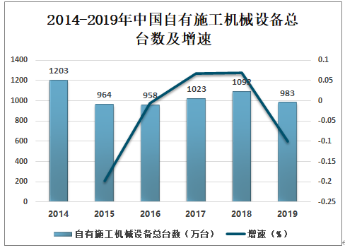 随着我国建筑行业的快速发展,在建筑施工技术和施工装备方面都取得了明显的进步。2019年中国自有施工机械设备总台数为983万台,较上年减少109万台,同比下降9.98%。2014-2019年中国自有施工机械设备总台数及增速