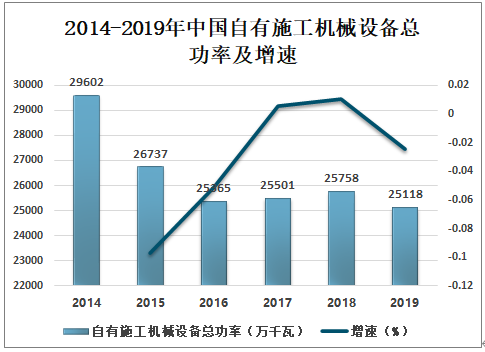 2014-2019年中国自有施工机械设备总功率及增速
