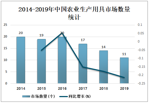 2016-2019年中国农业生产用具市场数量逐年减少,2018年中国共有农业生产用具市场14个,较2017年减少了3个;2019年中国共有农业生产用具市场11个,较2018年减少了3。