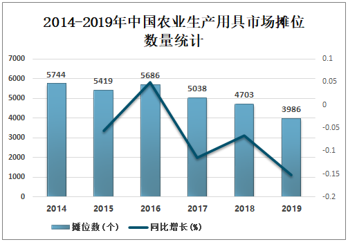 随着中国农业生产用具市场数量的减少,摊位数量也在减少,2018年中国农业生产用具市场共有摊位4703个,较2017年减少了335个;2019年中国农业生产用具市场共有摊位3986个,较2018年减少了717个。2014-2019年中国农业生产用具市场摊位数量统计