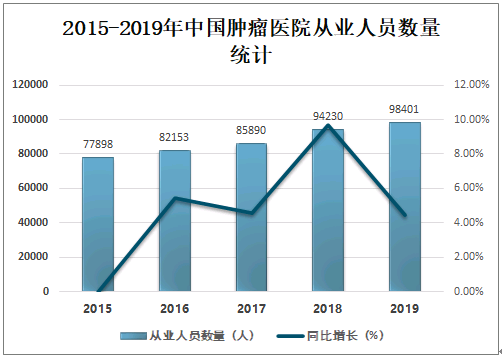 中国肿瘤医院从业人员数量持续增长,2018年中国肿瘤医院从业人员数量为94230人,较2017年增加了8340人;2019年中国肿瘤医院从业人员数量达98401人,较2018年增加了4171人。