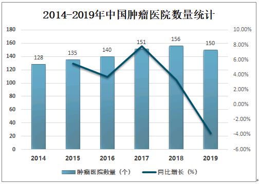 2014-2018年中国肿瘤医院数量持续增加,2018年中国共有肿瘤医院156个,较2017年增加了5个,2019年较2018年有所下滑,2019年中国共有肿瘤医院150个,较2018年减少了6个。