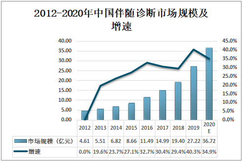 中国的伴随诊断市场还处于初期阶段,但随着精准医疗的发展,预计很快会迎来高速发展期。2012-2019年中国伴随诊断逐年增加,2019年中国伴随诊断市场规模达到27.22亿元,较2018年的19.40亿元同比增长40.3%,预计2020年中国伴随诊断市场规模将达到36.72亿元。