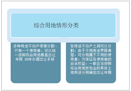 综合用地应当是指同一宗地包含两种或两种以上不同用途的土地,例如商业、居住综合用地,科研设计、办公综合用地等。综合用地可以分两种情形,一种是多种用途不动产很难分割、只有一个使用者;另一种是各用途不动产之间可以分割,往往最终使用者为不同的单位、个人,例如底下两层为商业、上面为居民住宅楼等。对于第一种情况,可以统一按照综合用地最高出让年限 50年办理出让手续;对于第二种情况,由于不同用途界限清楚,可分别属于不同的使用者,为保证各使用者的合法权益,一般应当按照综合用地所包含的具体土地用途分别确定出让年期。