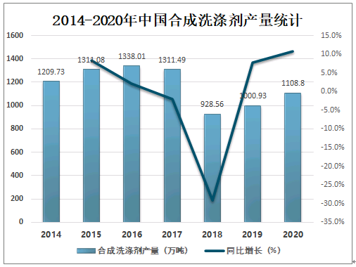 作为人们日常生活的一种消费品,洗涤用品无疑已有巨大的市场,合成洗涤剂已成为人们日常生活中不可或缺的消费品之一。2020年中国合成洗涤剂产量达1108.8万吨,较2019年增加了107.87万吨,同比增长10.8%。