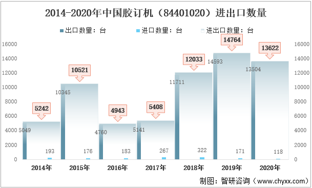2020年中国胶订机(84401020)进出口数量13622台,较2019年减少1142台。其中:出口数量13504台,较2019年减少1089台;进口数量118台,较2019年减少53台。2014-2020年中国胶订机(84401020)进出口数量