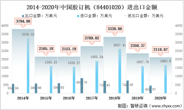 2014-2020年中国胶订机(84401020)进出口金额
