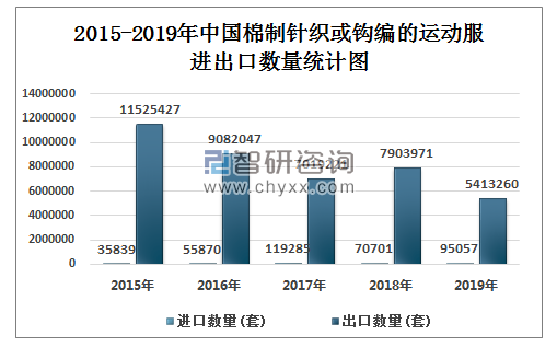 2015-2019年中国棉制针织或钩编的运动服 进出口数量统计图