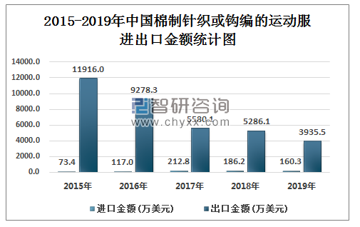 2015-2019年中国棉制针织或钩编的运动服 进出口金额统计图