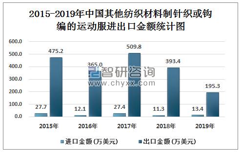 2015-2019年中国其他纺织材料制针织或钩编的运动服 进出口金额统计图