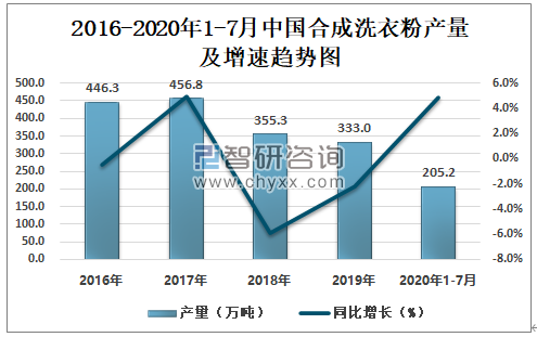 根据国家统计局数据显示:2020年7月中国合成洗衣粉产量为32.7万吨,同比增长7.8%;2020年1-7月中国合成洗衣粉产量为205.2万吨,同比增长4.8%。