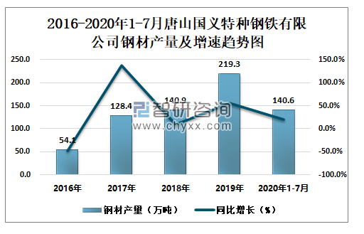 2016-2020年1-7月唐山国义特种钢铁有限公司钢材产量及增速趋势图