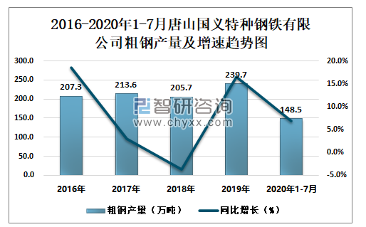2016-2020年1-7月唐山国义特种钢铁有限公司粗钢产量及增速趋势图