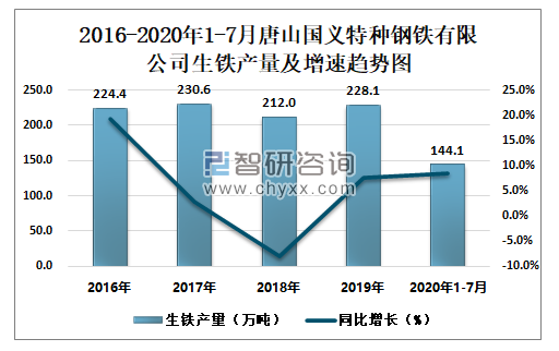 2016-2020年1-7月唐山国义特种钢铁有限公司生铁产量及增速趋势图