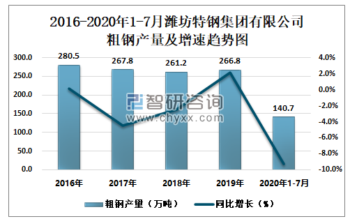 根据冶金工业信息中心数据显示:2020年1-7月潍坊特钢集团有限公司钢材产量为140.2万吨,同比下降8.2%;粗钢产量为140.7万吨,同比下降9.3%;生铁产量为140.1万吨,同比下降5.9%。