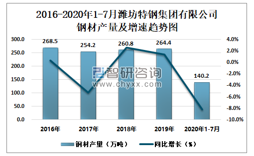 2016-2020年1-7月潍坊特钢集团有限公司钢材产量及增速趋势图