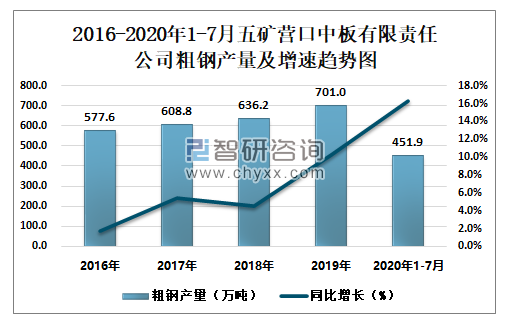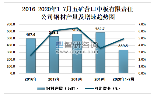 2016-2020年1-7月五矿营口中板有限责任公司钢材产量及增速趋势图