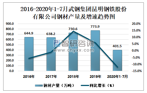 2016-2020年1-7月武钢集团昆明钢铁股份有限公司钢材产量及增速趋势图