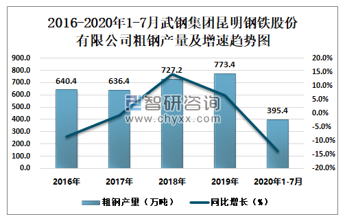 2016-2020年1-7月武钢集团昆明钢铁股份有限公司粗钢产量及增速趋势图