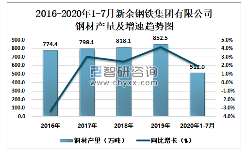 2016-2020年1-7月新余钢铁集团有限公司钢材产量及增速趋势图