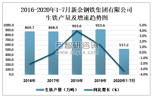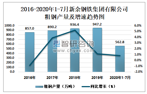 根据冶金工业信息中心数据显示:2020年1-7月新余钢铁集团有限公司钢材产量为512.0万吨,同比增长1.9%;粗钢产量为562.8万吨,同比增长0.8%;生铁产量为517.2万吨,同比下降3.3%。