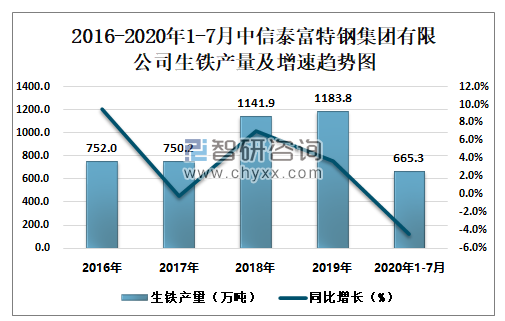 2016-2020年1-7月中信泰富特钢集团有限公司生铁产量及增速趋势图