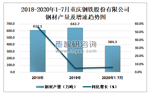 根据冶金工业信息中心数据显示:2020年1-7月重庆钢铁股份有限公司钢材产量为384.3万吨,同比增长6.1%;粗钢产量为402.0万吨,同比增长5.4%;生铁产量为345.8万吨,同比下降1.1%。