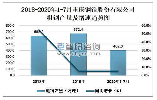 2018-2020年1-7月重庆钢铁股份有限公司粗钢产量及增速趋势图