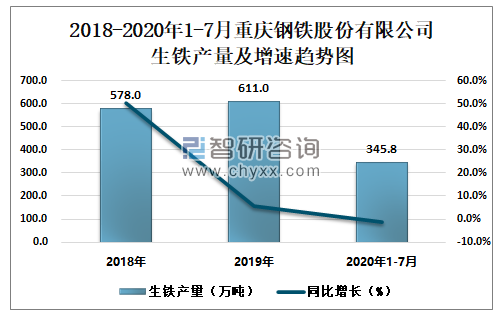 2018-2020年1-7月重庆钢铁股份有限公司生铁产量及增速趋势图